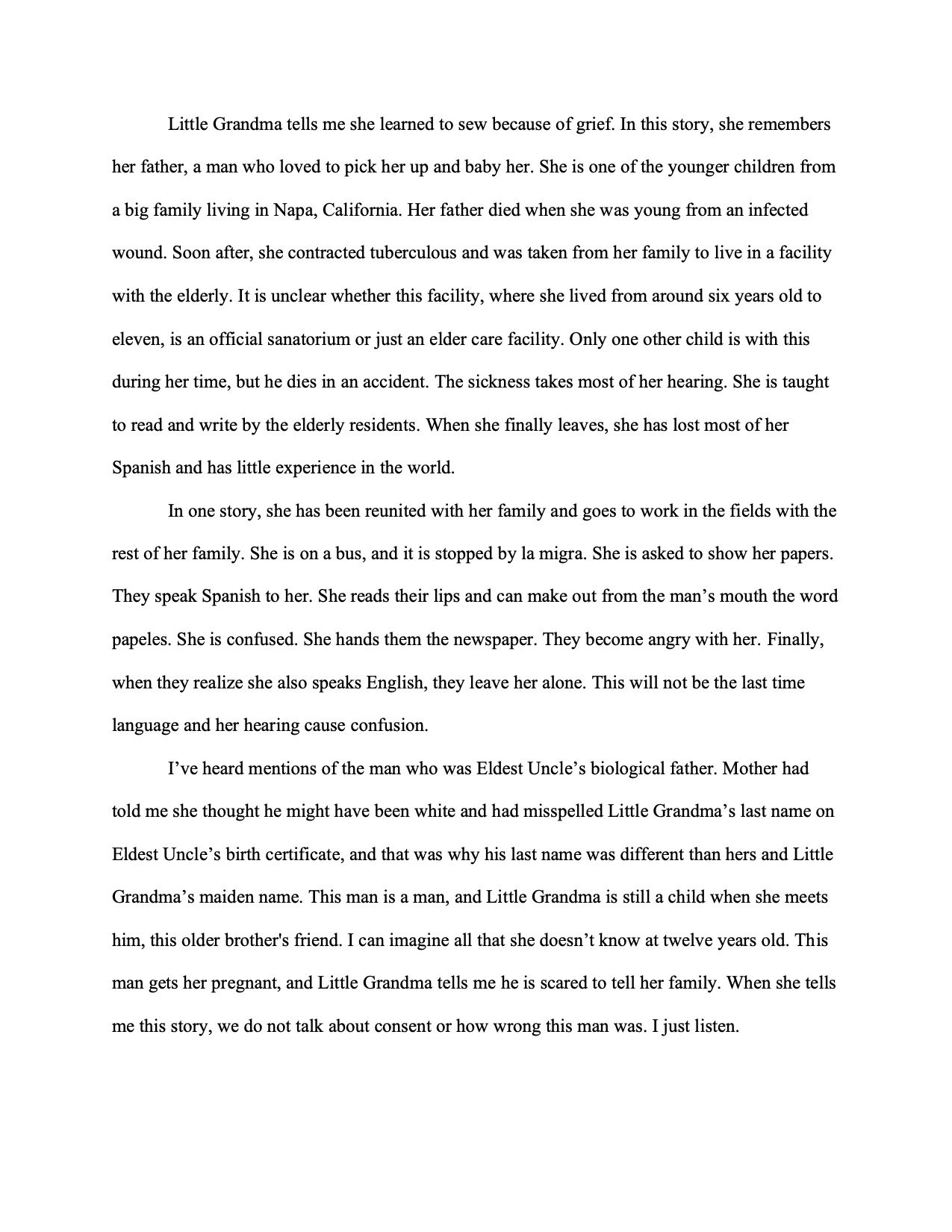 My brother’s girlfriend is the first to compliment the food, and we agree. She is genuinely excited to eat at this run-of-the-mill, B-Grade Americanized Mexican place just because it's where my brother grew up. She told me once—that afternoon at the concert, before I blacked out and disappeared—that my brother doesn’t talk about his past, his emotions, or his ambitions. “So I’m really excited to finally see where he grew up, your parents’ house,” she had said. It was her first time meeting them and staying in my brother’s childhood room. At her description of my brother’s emotional unavailability, I remember wanting to take her by the shoulders and scream, THAT’S NOT NORMAL! How can you even say you know each other? What do you even talk about? But I was two tallboys in and about to accept a jar of homemade moonshine from that friend of my brother’s. She and I didn’t finish our conversation.