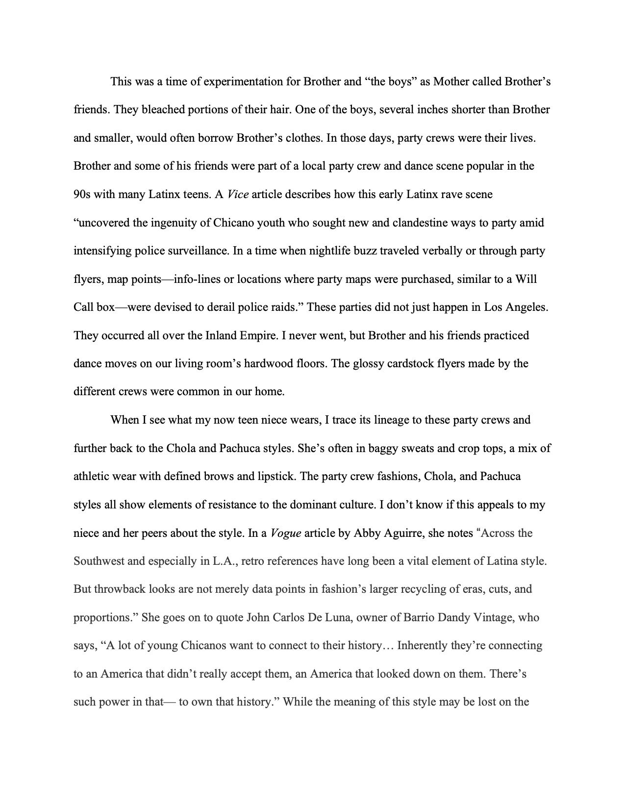This, I know, is my brother’s way of saying, I would have fucked him up if he ever tried anything. I know, too, that ruthless, intellectual scorn is the most pain he could inflict on another person. I usher out the thought creeping in of the night I disappeared and all the texts my brother sent, looking for me, that I found when conscious again in the not-quite-morning. In the present moment, I decide to accept my brother’s way of brothering, and I release the impulse to wonder what more he could have done that night, wonder if he would have done anything at all. I know, now, he would have, and I finally place some blame on the one, blame-worthy person: not my brother, not myself.